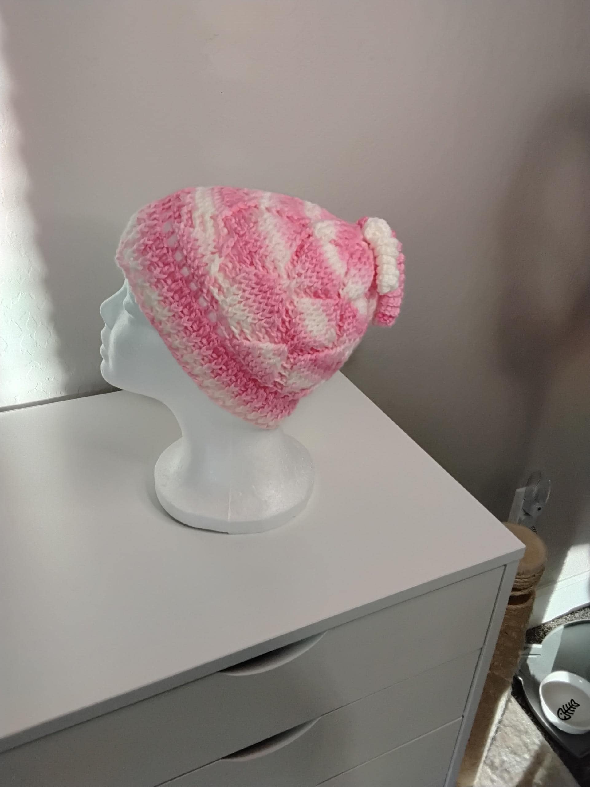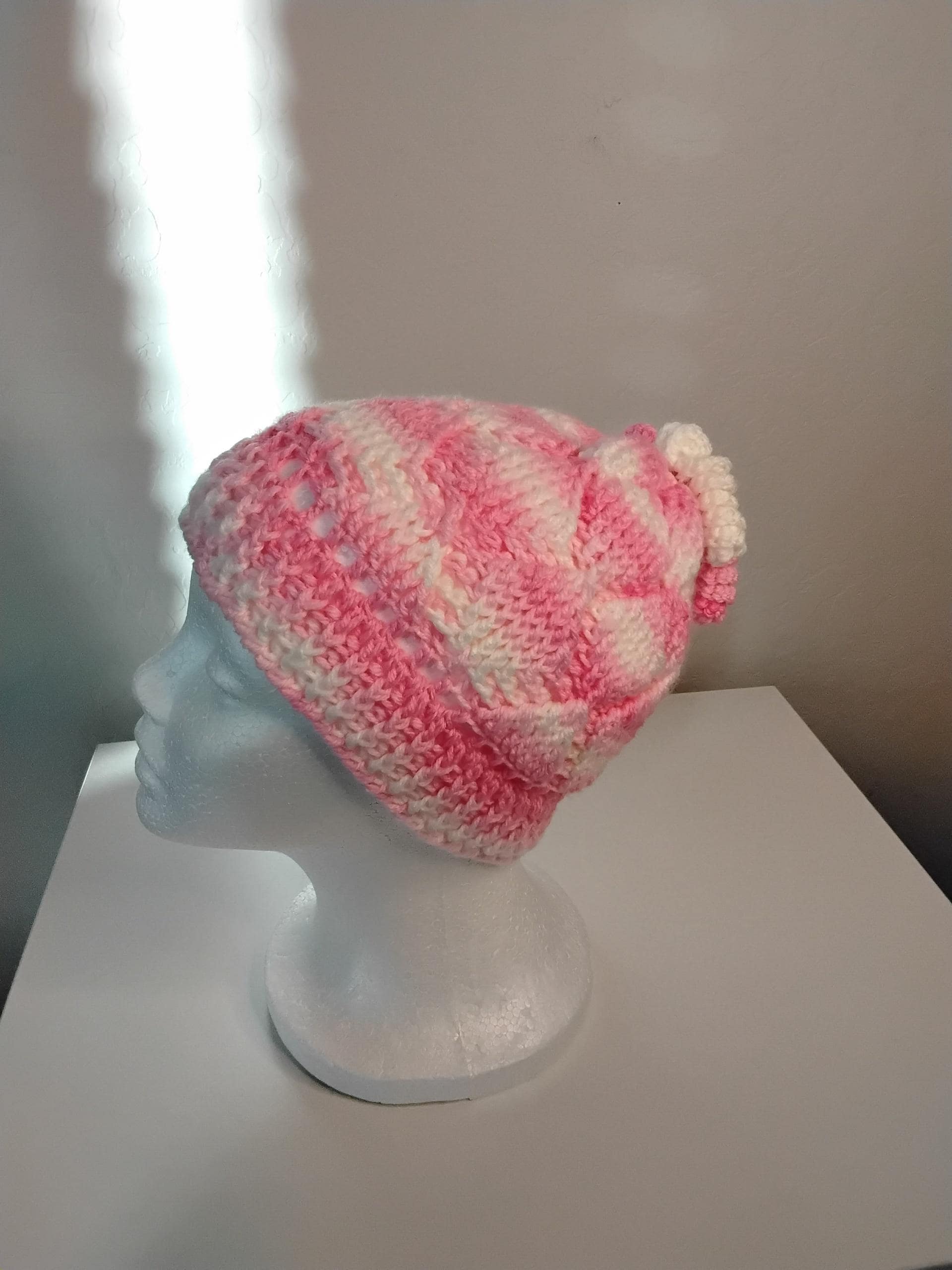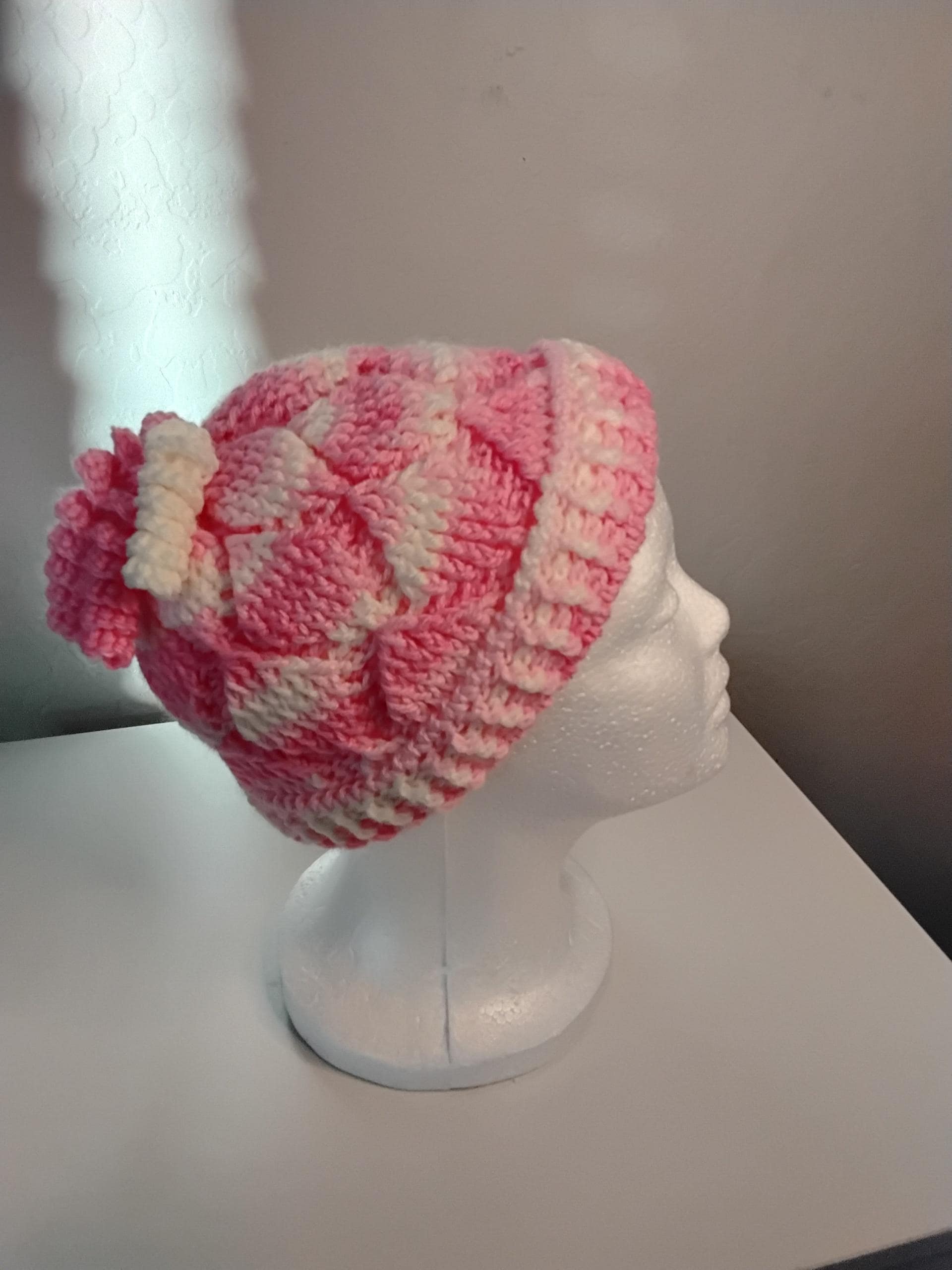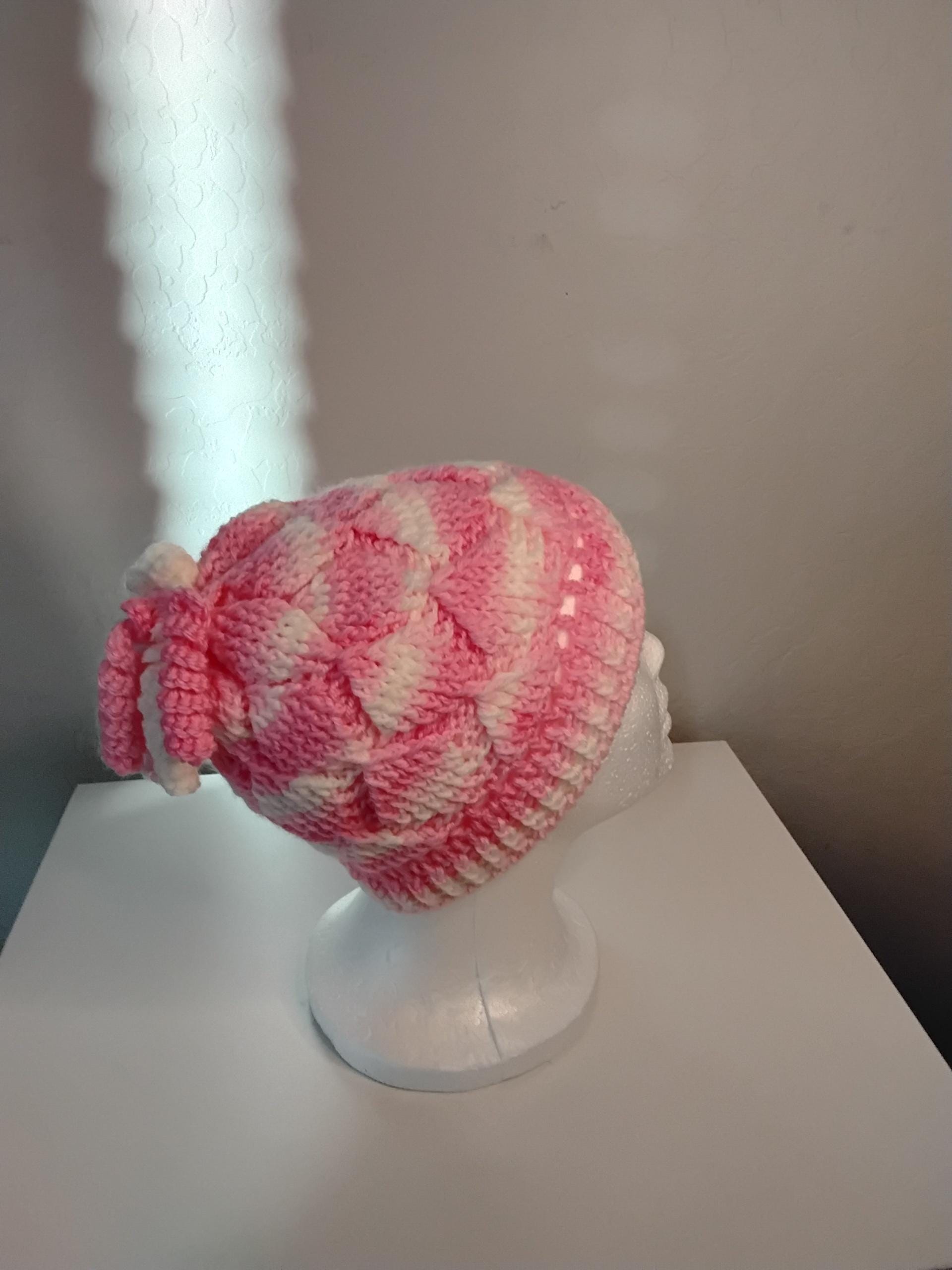 Corkscrew Curls Beanie is made 100% acrylic yarn, washable and dryable on low temps. Measurements are, rolled brim top to bottom is approximately 6", unrolled brim is 8" top to bottom. Rolled brim circumference is 16" will stretch to 18", unrolled brim is 19" will extend approximately to 20". Please be sure of head size for beanie fit. Colors very with different monitor screens.