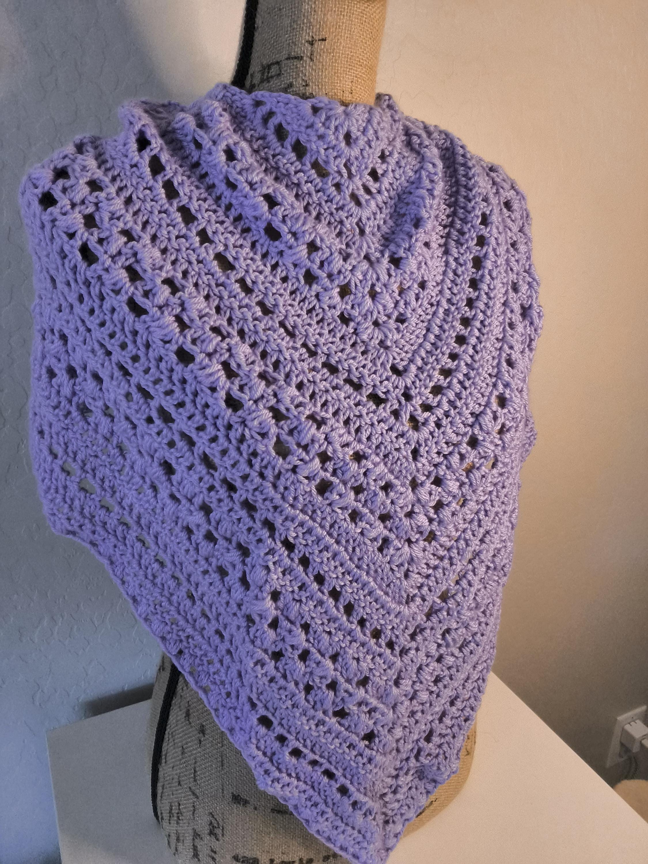 Soft and slinky acrylic yarn. A soft violet color with a hint of blue. Easy care, wash on delicate cold water and dry on low temperature. Casual wear, business or an evening out. Measurements approximately center down to the point 28". Long edge approximately 60".