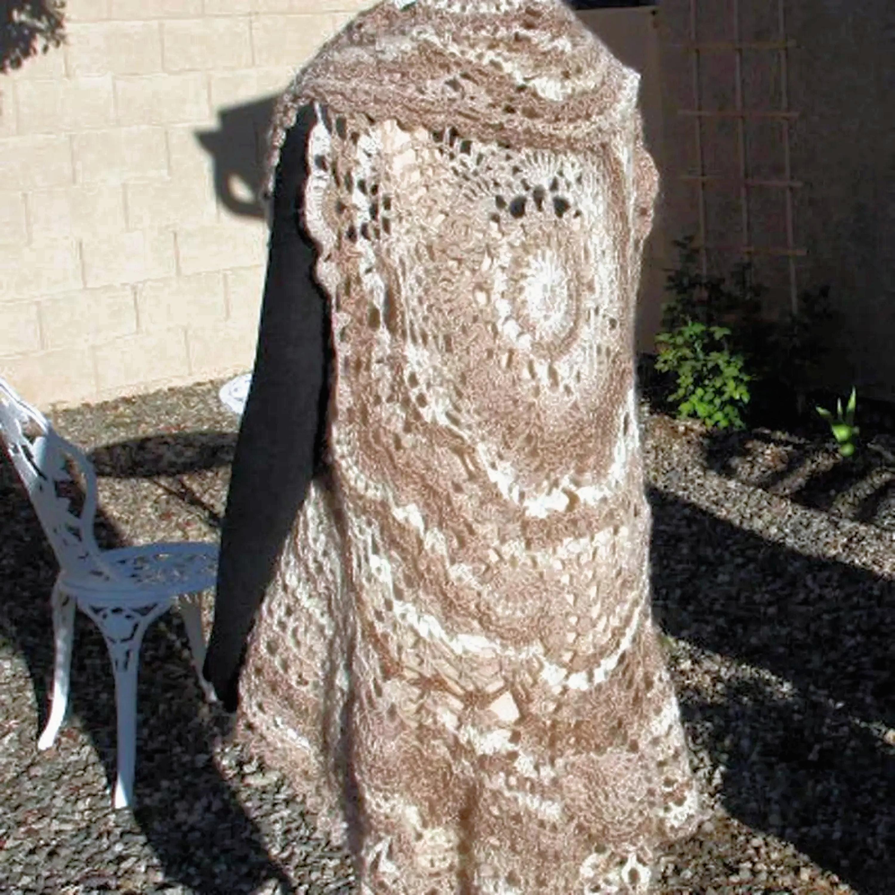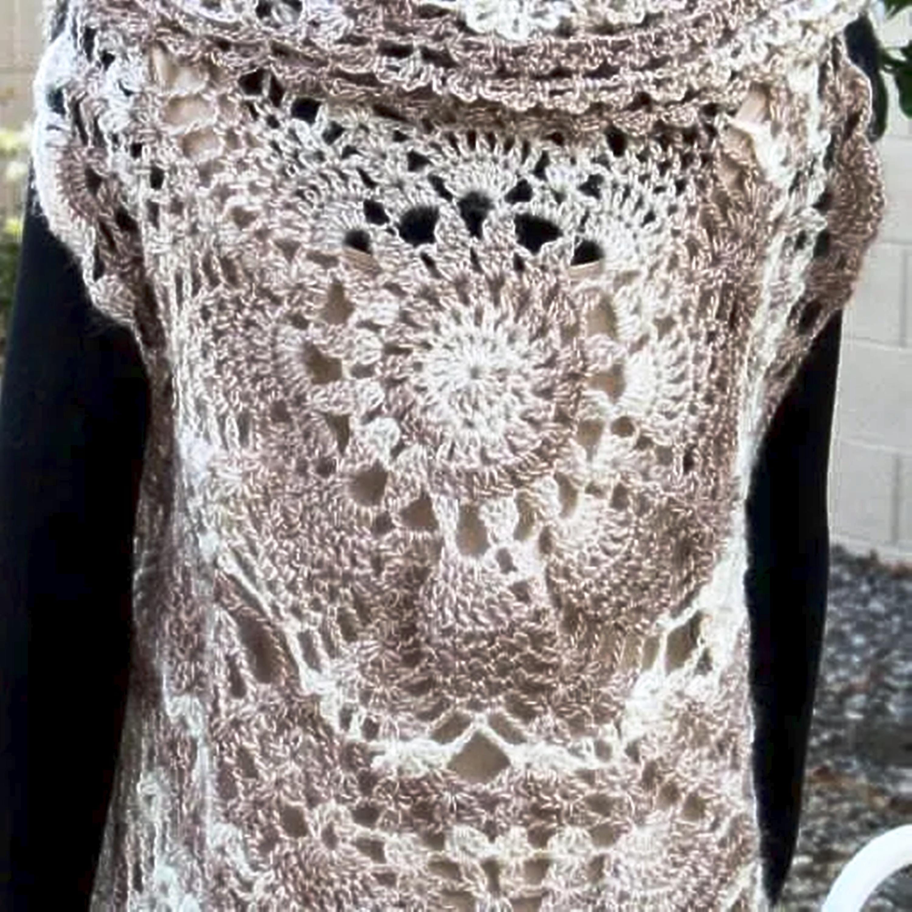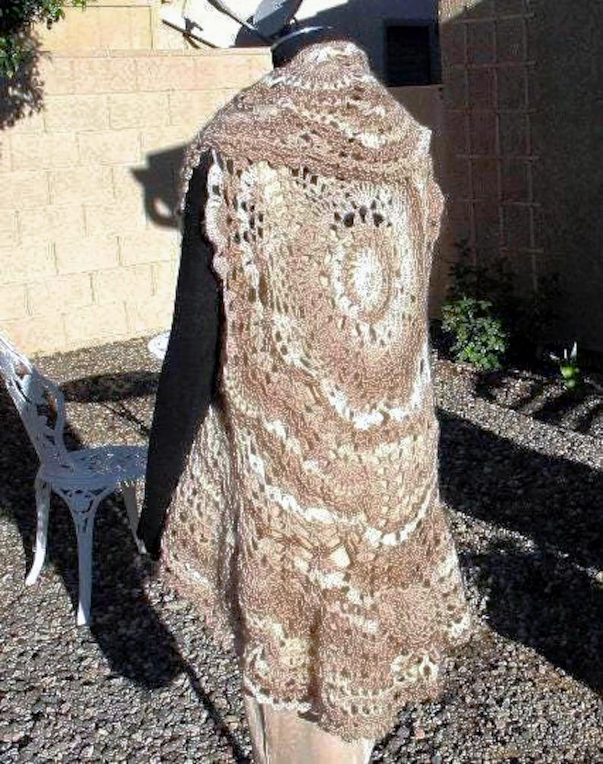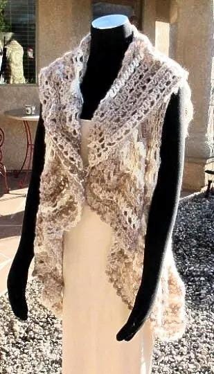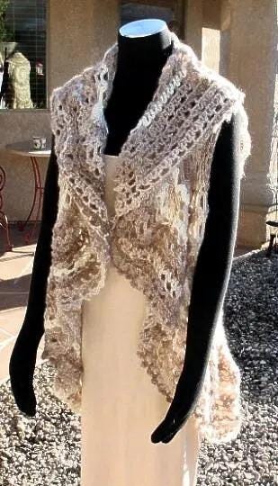 Light and Soft lacy long vest with elegant flowing movement. Variegated tones of tans, mocha, white and beiges.